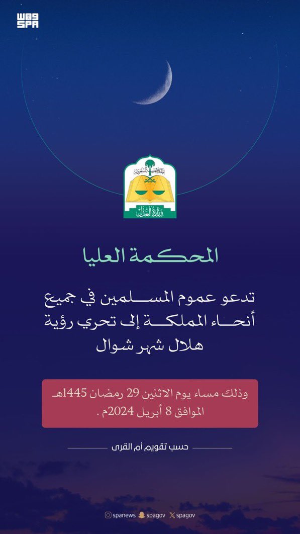 فنظراً لما تضمنه قرار المحكمة العليا رقم ( 180 / هـ ) وتاريخ 29 / 8 / 1445هـ أن يوم الاثنين 1 / 9 / 1445هـ ـ حسب تقويم أم القرى ــ الموافق 11 / 3 / 2024م، هو غرة شهر رمضان المبارك لعام 1445هـ؛ فإن المحكمة العليا ترغب إلى عموم المسلمين في جميع أنحاء المملكة تحري رؤية هلال شهر شوال مساء يوم الاثنين 29 / 9 / 1445هـ ــ حسب تقويم أم القرى ــ الموافق 8 / 4 / 2024م.